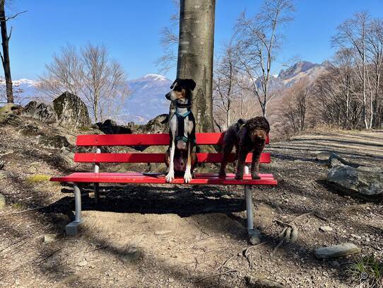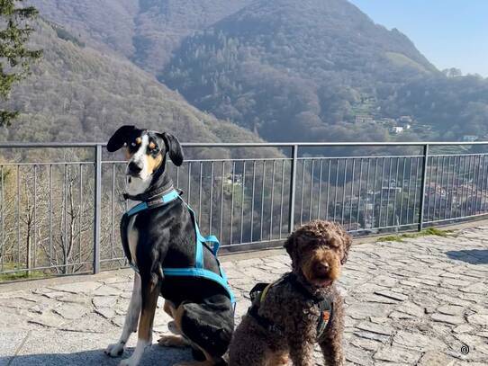 We are up early on Saturday. We enjoy the peace and quiet and the beautiful view on our first walk with the dogs. It's the perfect way to start the day! Before we set off on our hike, we have another delicious porridge and then get ready. We pick up a hiking map of the region at reception and are given friendly advice about the hiking options on Monte Bré.